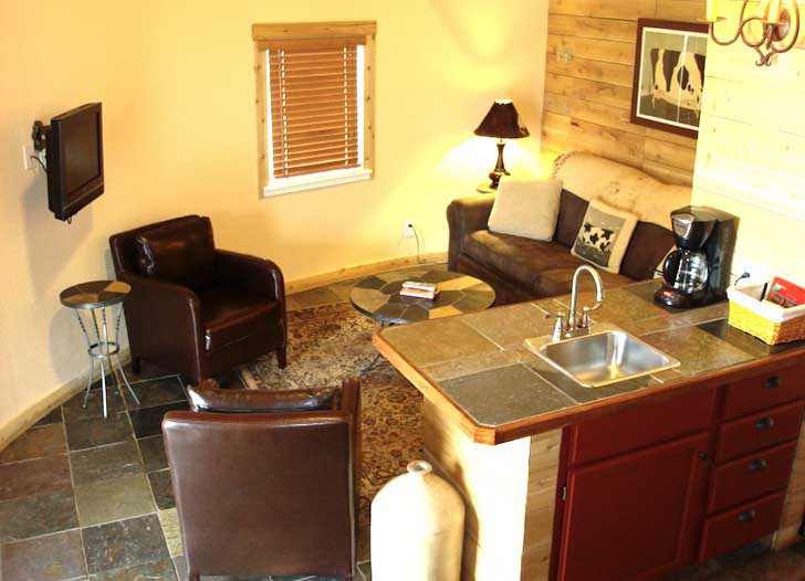The silo is certainly charming and quaint from the outside, and the inside is no different. It accommodates up to four guests, and features one king bed and two twin beds. There’s also wifi, a television, rustic-chic bathroom, kitchenette, and mini living room.