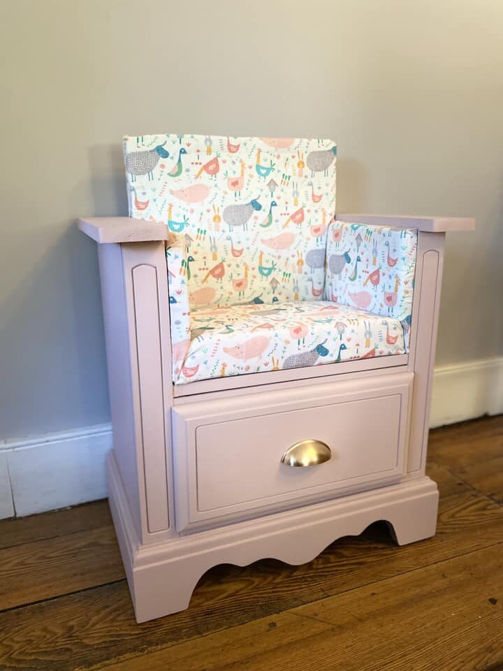 Brittany Lancaster has nailed this upcycling project – and this is actually her third! This cute pastel pink night stand was turned into this sweet little reading chair with the sweetest print on the fabric. The drawer is still in action, which makes it ideal for storing books, toys, even some toasty reading socks.