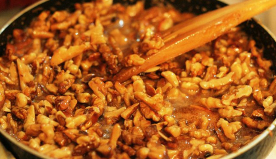 But here’s the thing—this is not your destination. You let it cool down, and then put it back on the heat, two or three times. Repeats caramelize the honey correctly. The last time, you put your roasted walnuts in, stir like a lunatic to coat, and then let it go on low for another 5–7 minutes.