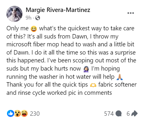 The distressed homeowner posted a snapshot of her sudsy ordeal, seeking advice from the online community: “What’s the quickest way to take care of this? It’s all suds from Dawn; I throw my Microsoft fiber mop head to wash, and a little bit of Dawn. I do it all the time, so this was a surprise. I’ve been scoping out most of the suds, but my back hurts now 🤦🏻♀️. I’m hoping running the washer in hot water will help 🙏🏼.”