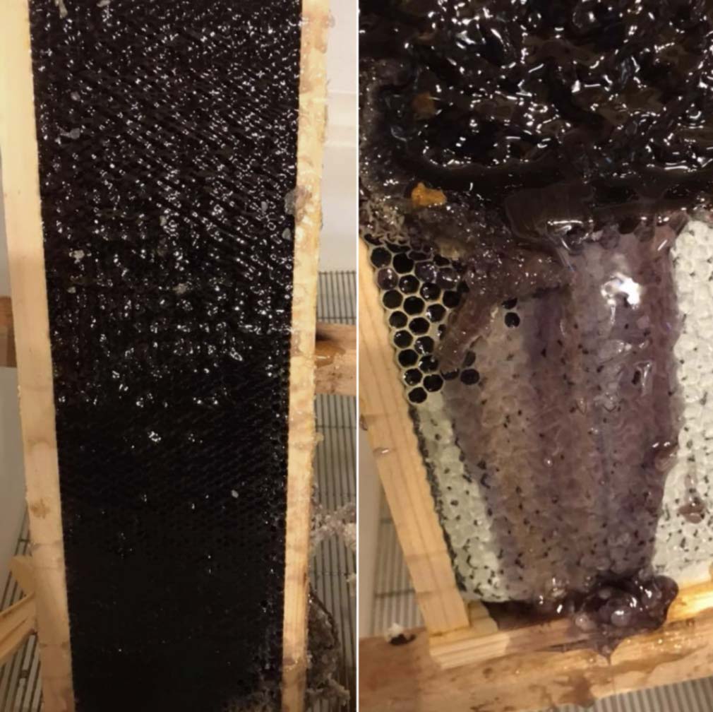 According to Morrissey, “We extracted about 2 liters of deep purple honey from one hive last week, here in a rural part of Durham, NC. It has the color of blackberry syrup (not blue Kool-Aid) and has a nice, slightly sour, berry flavor to it.”
